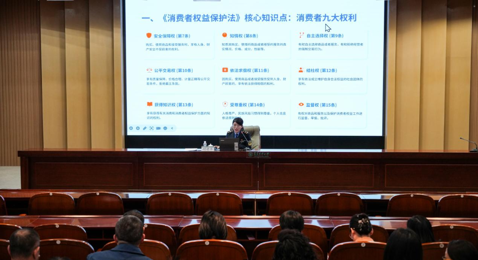 启动仪式后,城阳区市场监督管理局消费者权益保护科高级经济师胡建华为师生作“3·15”消费者权益保护法普法宣传专题讲座,结合国际消费者权益日时间节点,对《消费者权益保护法》重点内容进行深入解读,并针对网络校园贷、网络购物陷阱、培训消费陷阱、预付式消费风险、食品安全维权等大学生消费维权的热点问题,进行典型案例剖析与维权策略指导。