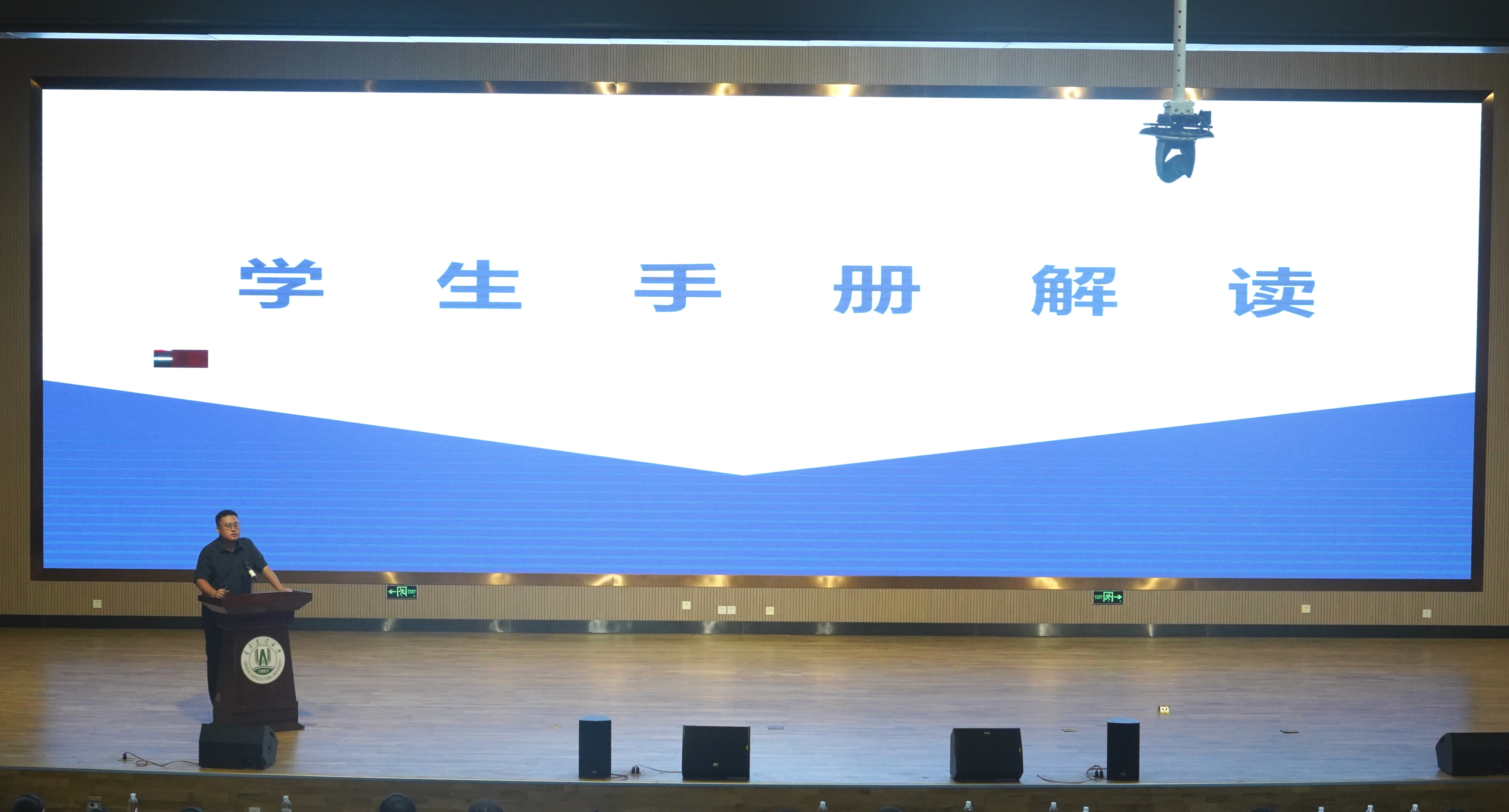 团委书记曹斯亢聚焦学生手册解读,重点强调纪律规范与处分流程,帮助新生在军训及大学生活中更加严于律己、笃学求知。