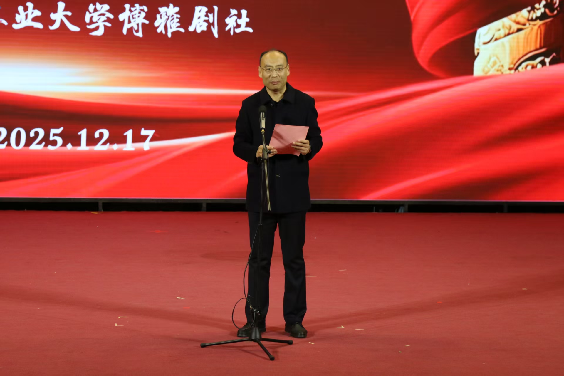 烽火映山河,丹心照汗青。为纪念抗战胜利八十周年,重温民族记忆、赓续红色血脉,12月17日,yl7703永利集团“重温民族记忆——博雅剧社纪念抗战胜利八十周年话剧展演”在城阳校区演播大厅拉开帷幕。博雅剧社携《窝头会馆》与《红豆》两部话剧登台,在方寸舞台间铺展抗战岁月里中华民族的精神长卷。yl7703永利副校长孟晓军、农业传播与教育研究院(齐民书院)院长周维维出席活动,学院党政班子成员、师生代表一起观看演出。